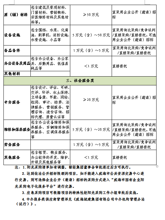 第十七條 本制度規(guī)定的采購范圍包括工程建設(shè)項(xiàng)目、物資和社會(huì)服務(wù)的招標(biāo)采購(詳見附件一《威海城建集團(tuán)有限公司陽光采購清單》)。