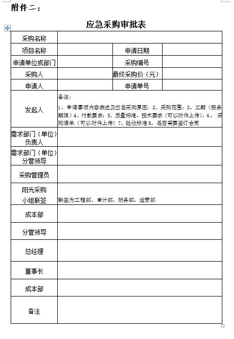 第二十二條 應(yīng)急采購經(jīng)需求部門(單位)負(fù)責(zé)人、分管領(lǐng)導(dǎo)、總經(jīng)理同意后由需求部門(單位)直接采購;事后由需求部門(單位)提交《應(yīng)急采購審批表》(詳見附件二),說明應(yīng)急采購的具體原因經(jīng)評(píng)審?fù)ㄟ^后,財(cái)務(wù)可直接付款。如果評(píng)審后認(rèn)定該事項(xiàng)不屬于應(yīng)急采購的,參照本制度第七章工作紀(jì)律進(jìn)行問責(zé)。