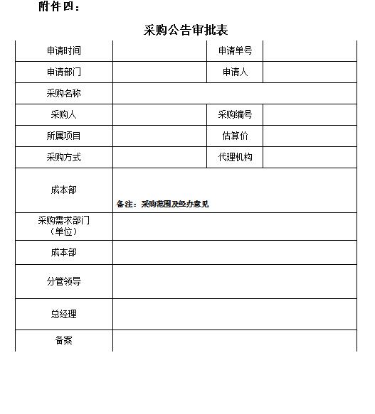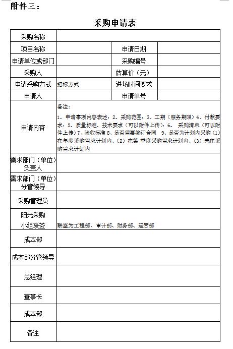 2.工作流程:需求部門(單位)提報(bào)《采購申請(qǐng)表》,按規(guī)定程序?qū)徟ㄟ^后,由成本部委托招標(biāo)代理機(jī)構(gòu)具體實(shí)施。