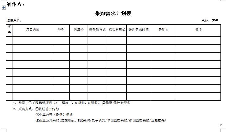 1.年度采購需求計(jì)劃表:需求部門(單位)應(yīng)在本年度12月10日前根據(jù)下一年度的工作任務(wù)和工作目標(biāo),編制并提報(bào)下一年度的《年度采購需求計(jì)劃表》;