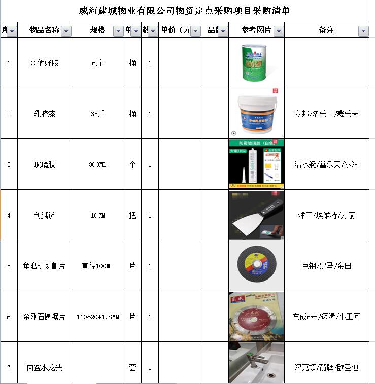 (5)采購內(nèi)容:威海建城物業(yè)物資定點采購,主要包括五金、水暖管件、保潔、維修、綠化所需物資、應(yīng)急維修的其他物資等,采購清單詳見附件。